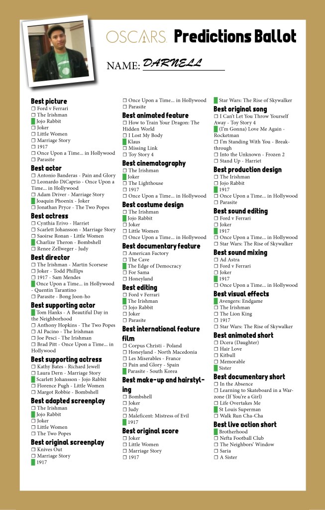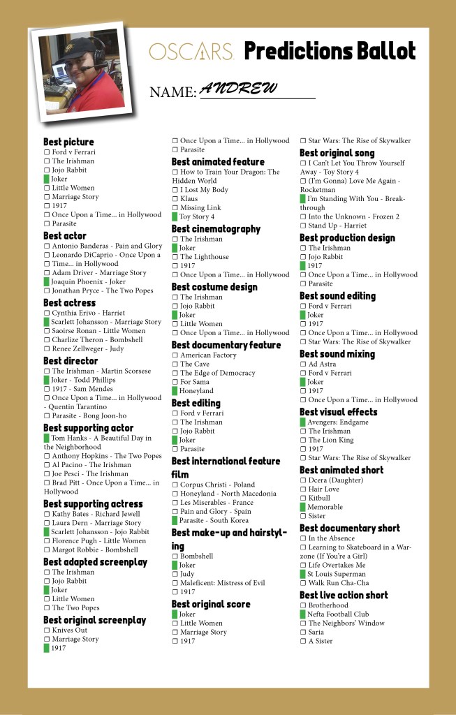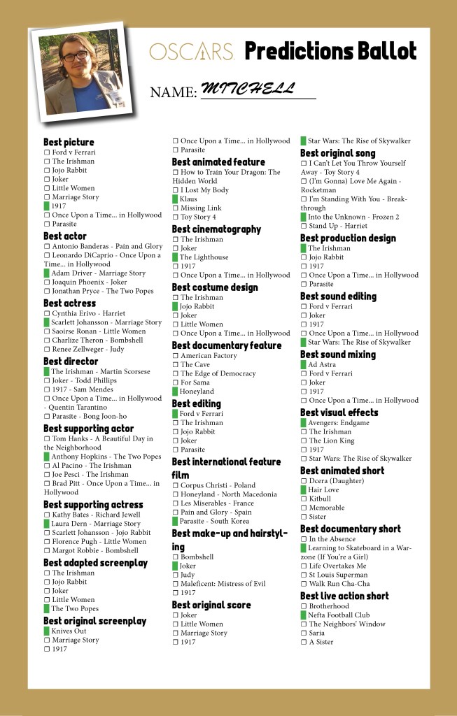 These are the movies/actors that I felt represented the best of the candidates. “1917” for sound since it had managed to work the bombastic nature of WW1 especially with its editing style. Phoenix as the Joker exceeded my expectations but I think overall I enjoyed “Jojo Rabbit” and “1917” in their respective categories the most.
