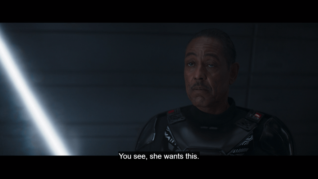 The finale naturally focuses on Din Djarin (Pedro Pascal), Boba Fett (Temuera Morrison), and Fennec Shand (Ming-Na Wen), and Cara Dune (Gina Carano) and their mission to save Grogu aka Baby Yoda aka The Child. They enlist the help of Mandalorians Bo-Katan Kryze (Katee Sackhoff) and Koska Reeves (Mercedes Vernando), who we met earlier this season. The two clash with Fett, who is not a true Mandalorian, but gets to wear Mandalorian armor because his dad was one, before they all mutually agree to take on Moff Gideon (Giancarlo Esposito), who is holding Grogu hostage. In it for Bo-Katan and Reeves is the Darksaber, a coveted Mandalorian weapon Bo-Katan needs to unite and rule Mandalore.
