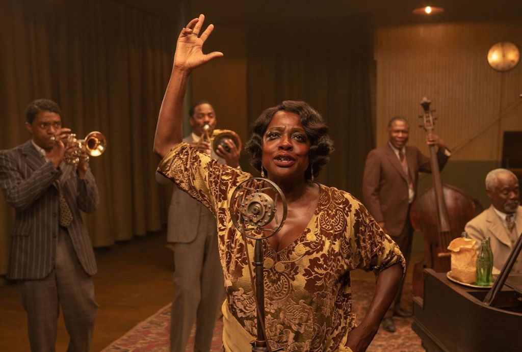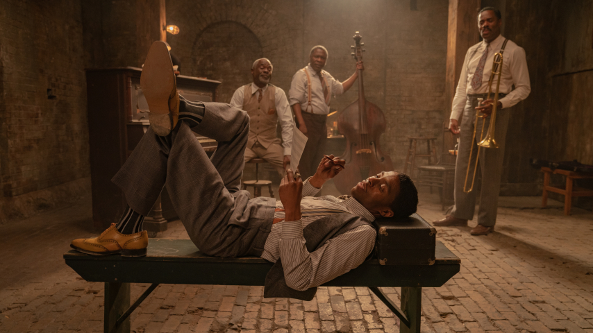 “Ma Rainey’s Black Bottom” follows the story of the “Mother of Blues” Ma Rainey (Viola Davis), who comes to Chicago in 1920 to reluctantly record a record with her band made up of Levee, guitar/ trombone player Cutler (Colman Domingo), pianist Toledo (Glynn Turman) and double bass player Slow Drag (Michael Potts). Accompanying them is Ma’s girlfriend, Dussie Mae (Taylour Paige), and her nephew, Sylvester (Dusan Brown), who Ma insists gets a speaking part in the record, despite the fact that he has a stutter. Working for the recording studio is Mel Sturdyvant (Johnny Coyne), its owner, and Irvin (Jeremy Shamos), Ma’s manager.