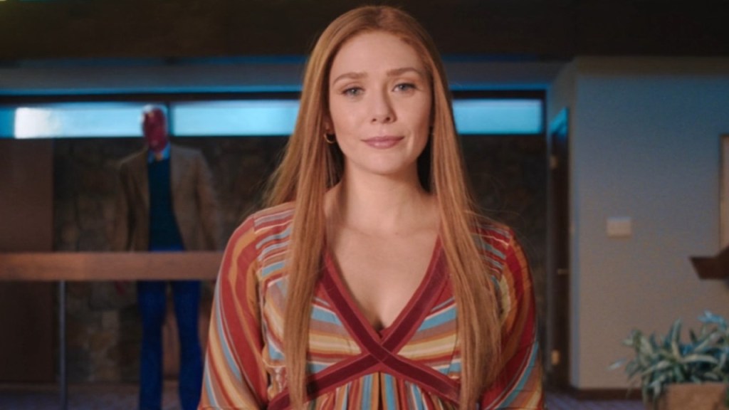Episode 3 “Now in Color” parodies 1970s sitcoms, and centers around the fact that Wanda Maximoff/Scarlet Witch (Elizabeth Olsen) is pregnant, and her babies develop fully in a matter of days as opposed to nine months. Her cramps also set off her superpowers, so most of the episode involves Wanda and Vision trying to maintain the appearance of normalcy despite these extraordinary circumstances, which culminate in her water breaking and Wanda having to give birth at home.