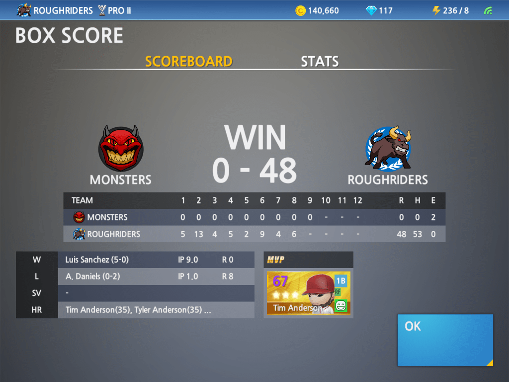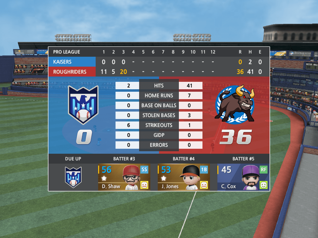 To give an example, my team, the Roughriders, has won 271 consecutive games by an average of 26.8 runs per game. The team’s top batter, Tim Anderson, has 62 homers and 204 RBI in the particular season they’re in, and the team has played just 33 games in this season.
