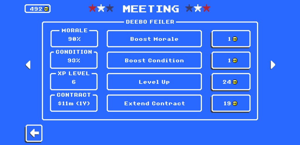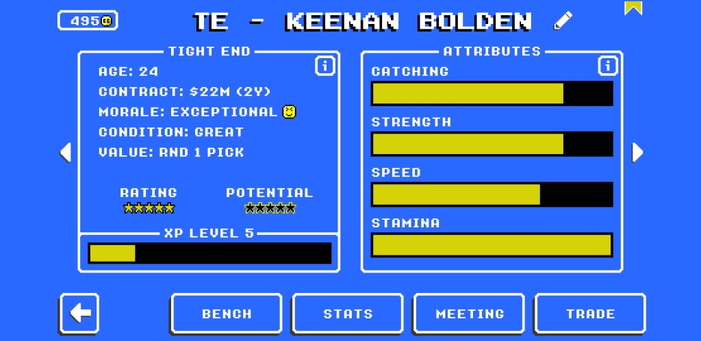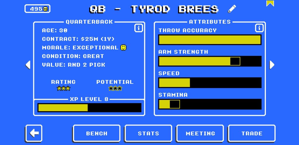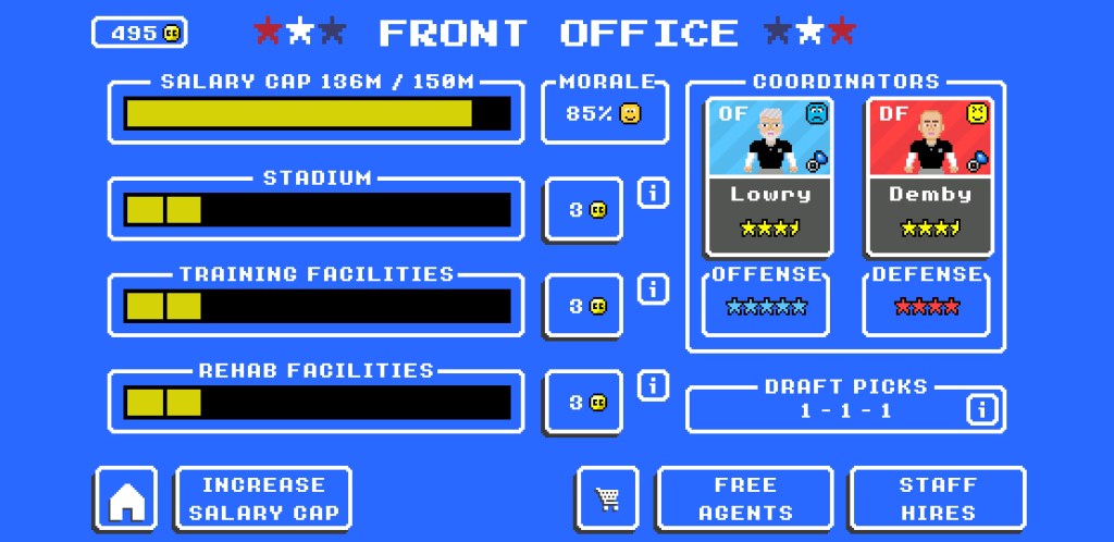 “Retro Bowl” has a salary cap just like the real NFL, and the way the game is balanced, it’s very easy to take over a new team, trade away most of the lackluster players for draft capitol, and then put together a talented, young roster with tons of cap to spare. The issue is, rookie contracts usually only last for about 2 years, after which star player contracts balloon, which will make you choose between letting a star or two go, or going cheap in other areas in your team (i.e. letting your defense take a hit to accommodate star offensive players).