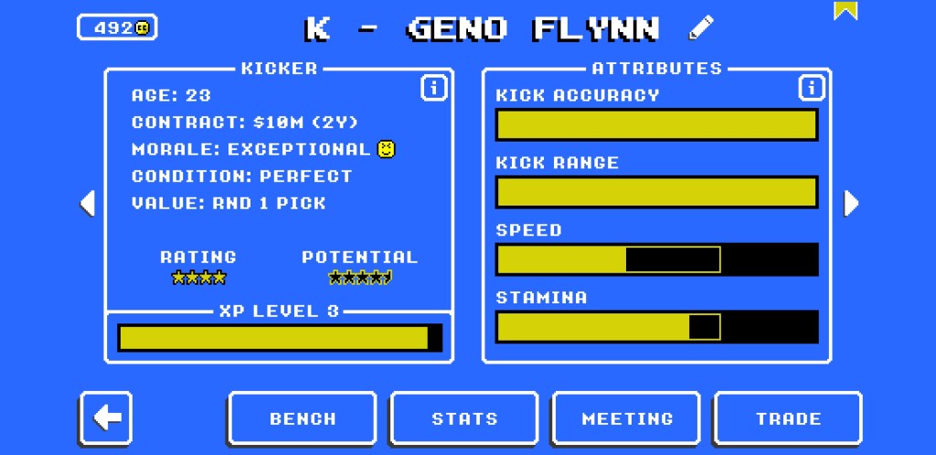 There are really only two stats relevant to kickers: kick accuracy and kick range. I actually recommend focusing on Kick Range first, as all Kick Accuracy seems to do is make the kicking minigame easier — something that’s not hard to master if you have good timing. Though I would also make sure that they have a decent stamina, as keeping this stat low will increase the likelihood that you’ll have to go a stretch of games with an injured kicker, which can be devastating in close games.