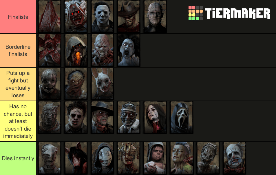 Ghostface got a little bit of a bump up from bottom tier, because Danny Johnson is a professional at killing people and remaining hidden until he’s ready to strike. Unlike Wraith, however, Ghostface cannot actually turn invisible and, much like Wraith, when found, Ghostface is pretty much just a guy with a knife. His expertise in espionage would prevent him from just instantly dying, but he has not a prayer of a chance taking on, say, Pyramid Head, Demogorgon or the Trapper.