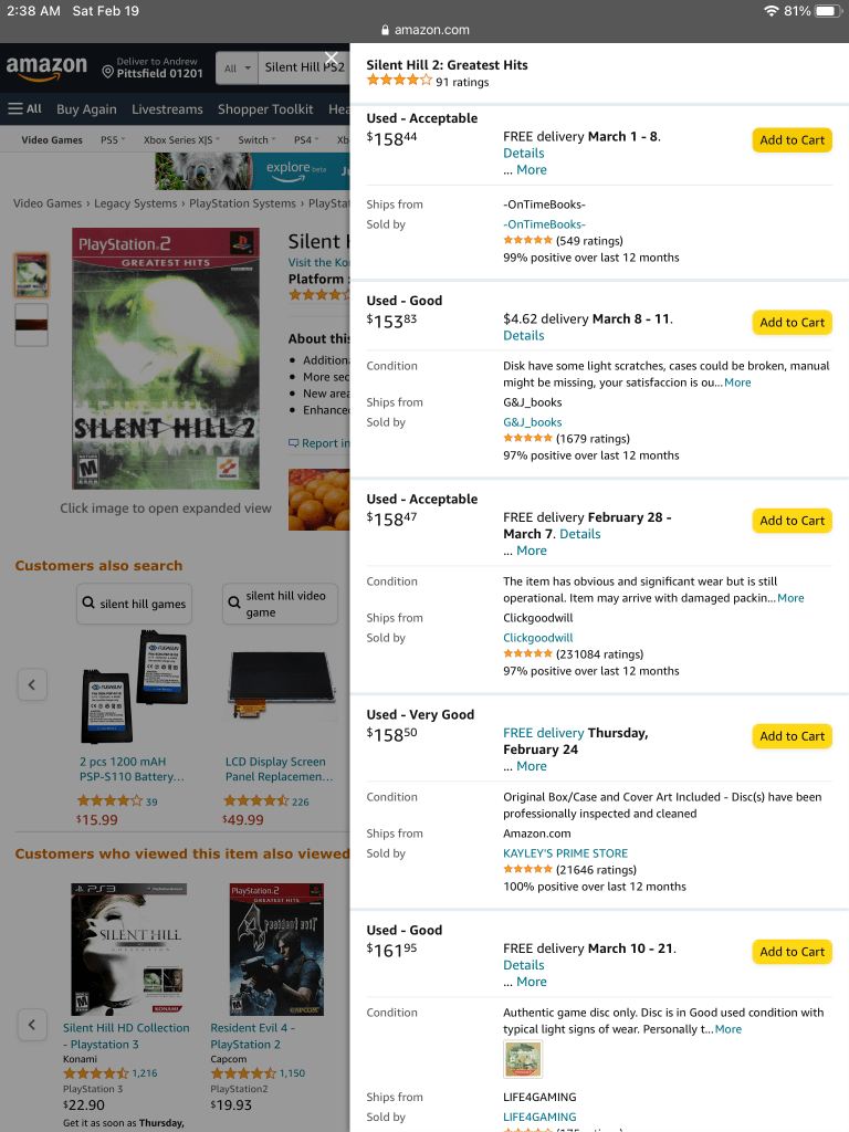 In the realm of monetary value associated with gaming, Silent Hill should be our first focus. As discussed earlier, Silent Hill debuted in the the last year of the 20th century, released games for a handful of years, then basically had an amalgamation of their older games ported into one for the PS3 roughly a decade ago. Let’s see how their online monetary value looks, using completed sales off of EBay and Amazon.