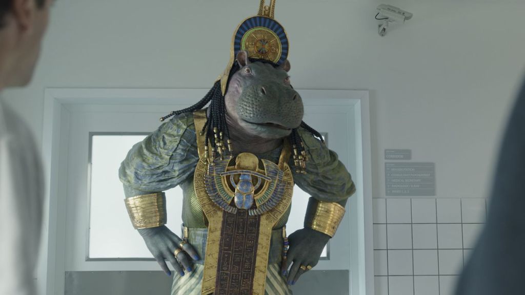 The hippo lady is revealed to be Tawaret (Antonia Salib) and that they’re both in Duat, the Egyptian Underworld and the psych ward they’re in is the inside of the boat bringing them to the Field of Reeds (an Egyptian paradise). But in their travel, Steven and Marc try to balance their hearts on the Scales of Justice to get in. This involves the two going through Marc’s memories, showing how his brother died and his mom blamed him, her abuse, and how Khonshu got him to be his avatar. Parallel to that, Marc is in the office of Dr. Harrow to work things through the two alters.