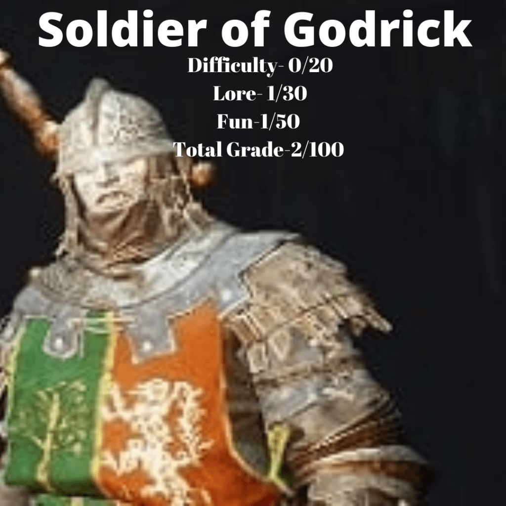 Mango: As far as fun goes, the Soldier of Godrick gets a 5 given how this is simply a regular enemy with slightly more health. Lore gets a 10 it’s interesting to theorize why he is in the Stranded Graveyard in the first place. Difficulty gets a 5- he is mechanically just a regular enemy with more health, so he is fairly easy to beat.