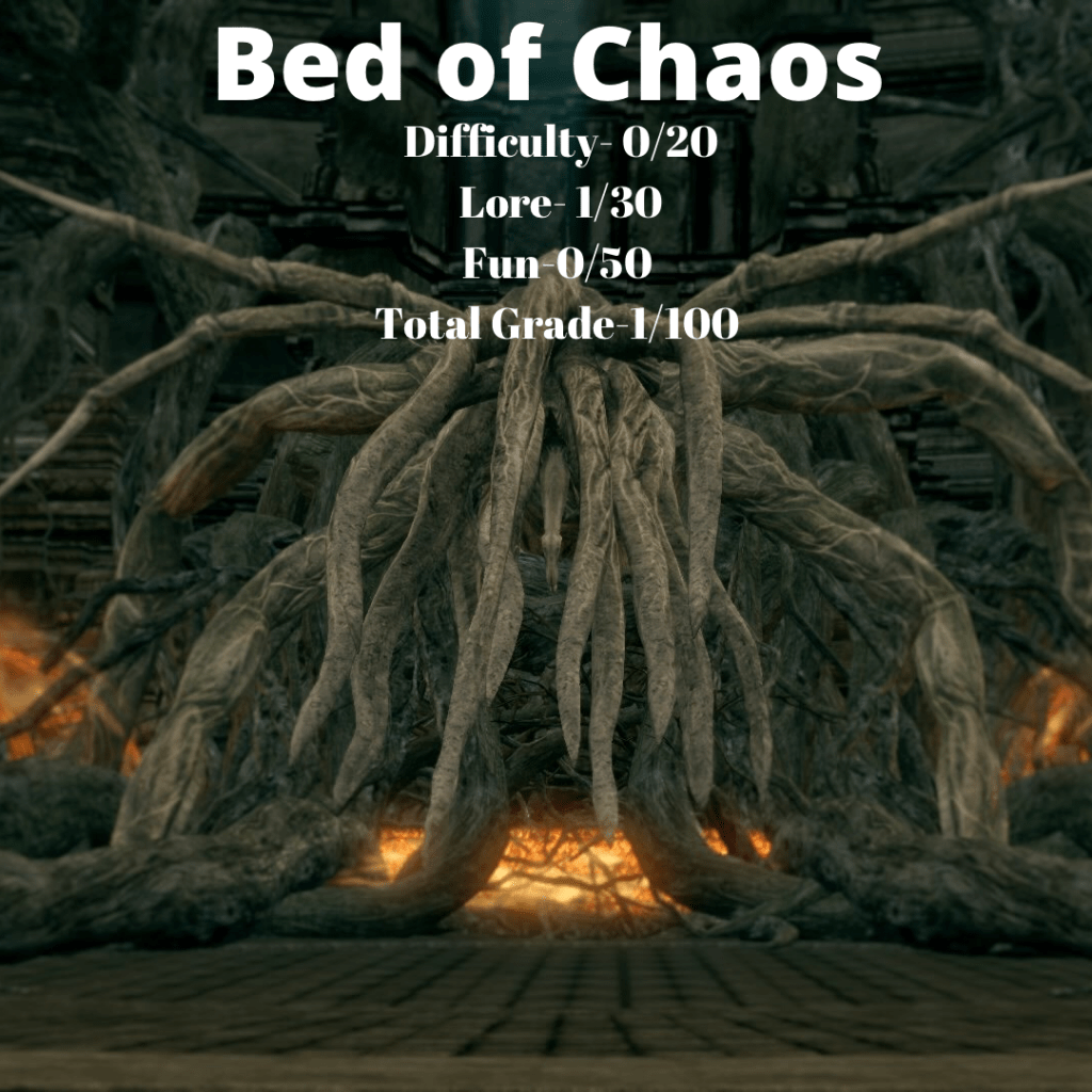 Mango: In terms of difficulty, this one gets a full 20 for being one of the most difficult and clunky bosses as far as maneuvering the area goes. Lore gets a 20 since this is a narratively important fight due to the Bed of Chaos giving a Lord Soul when you defeat it. Because of how notoriously annoying this fight is, I was only able to give it a 5 for fun.