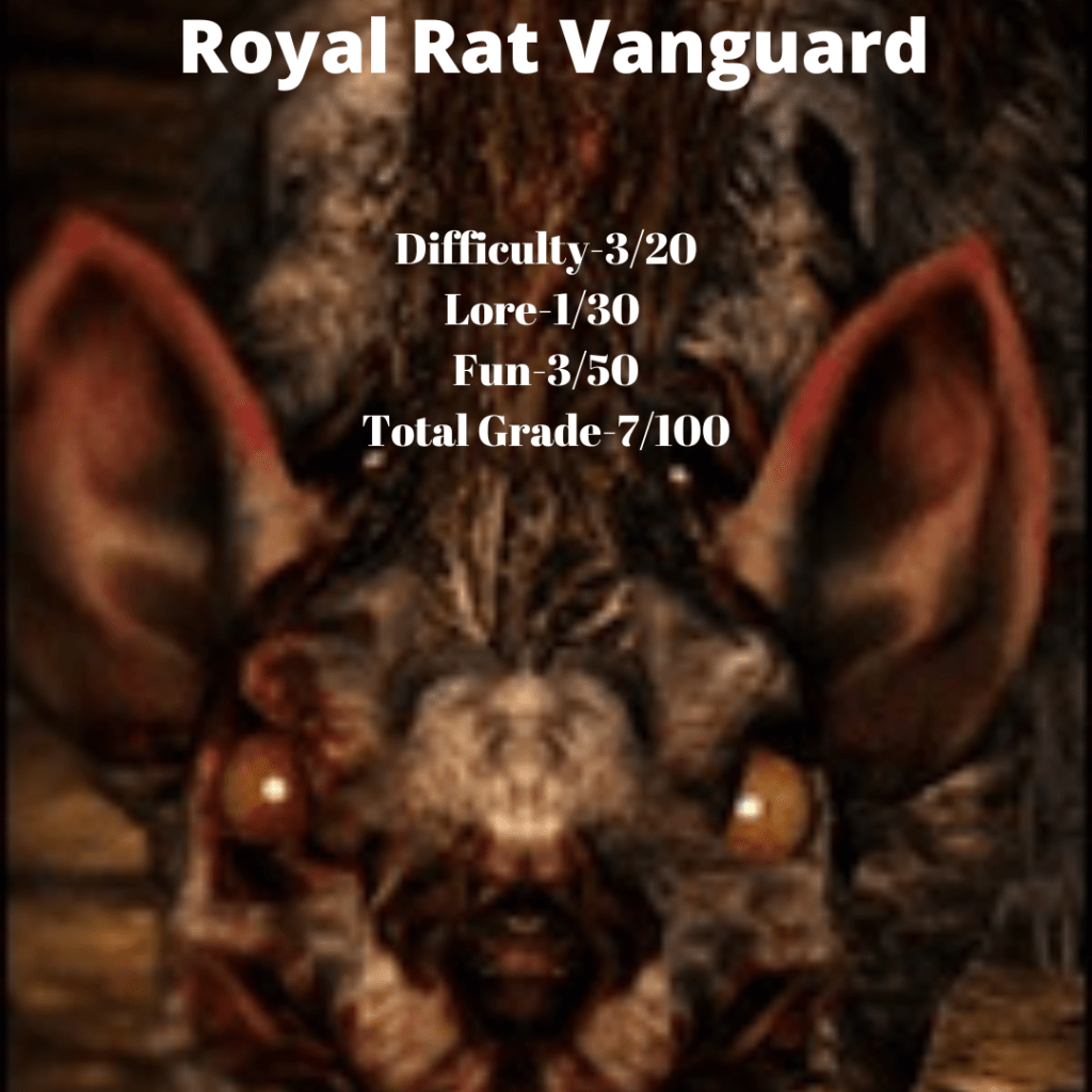 Mango: The large amount of rats can get overwhelming in this fight, so I gave it a 5 for difficulty. This is usually the first chance the player has to join the Rat Covenant, so even though this fight is optional, I gave it a 2 for lore. I didn’t feel it was a very engaging boss fight, so for fun, I gave it a 3.