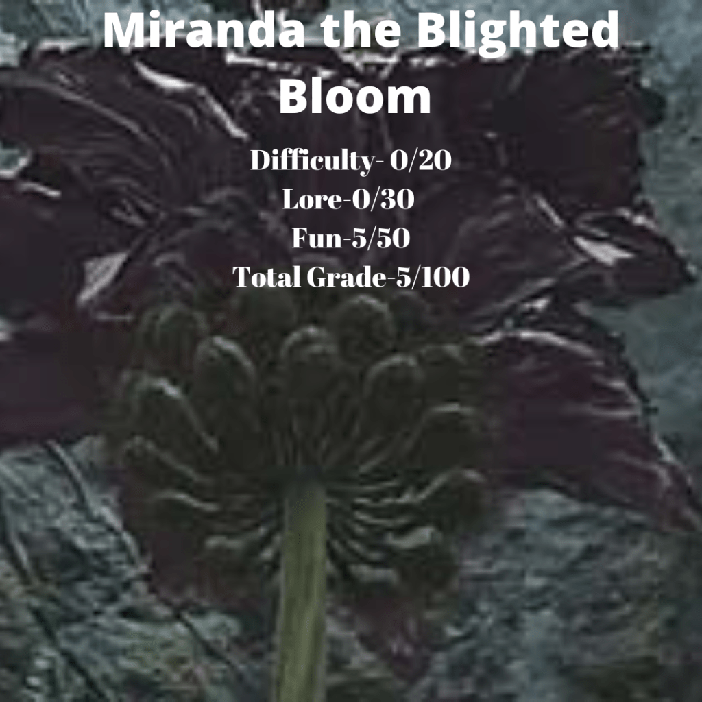 Mango: Overall, difficulty got a 10 for me. This boss is a little tricky to deal with. Unfortunately, plenty of enemies who look very similar to Miranda show up all over Elden Ring, so she only gets a 5 in lore for me because she looks the same and doesn’t meaningfully distinguish herself. Since Miranda is a fairly annoying fight, I only gave her a 5 for fun.