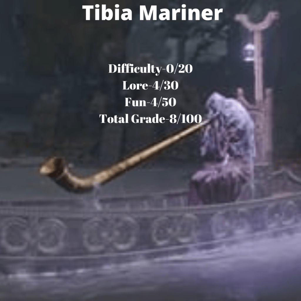 As far as lore goes, the Tibia Mariner is indirectly related to the Beast Clergyman and, by association, Black Blade Kindred and Maliketh the Black Blade. When defeated, it drops a precious Deathroot that the Clergyman is desperate to collect. He is so obsessed with these Deathroots that he will pay the player handsomely for continued delivery of them, starting off with a fairly uninteresting weapon that eventually becomes a strong Ash of War, Incantation, and then a highly coveted Ancient Dragon Somber Smithing Stone. Of course, this begs the question- Maliketh the Black Blade is incredibly strong, so strong that he could probably beat 50 Tibia Mariners all at once, not exaggerating. So why can’t he simply track these Tibia Mariners down and destroy them himself? As it is, Tibia Mariner’s lore being completely dependent on an NPC to have any substance does mean it can’t get too many points in this category.