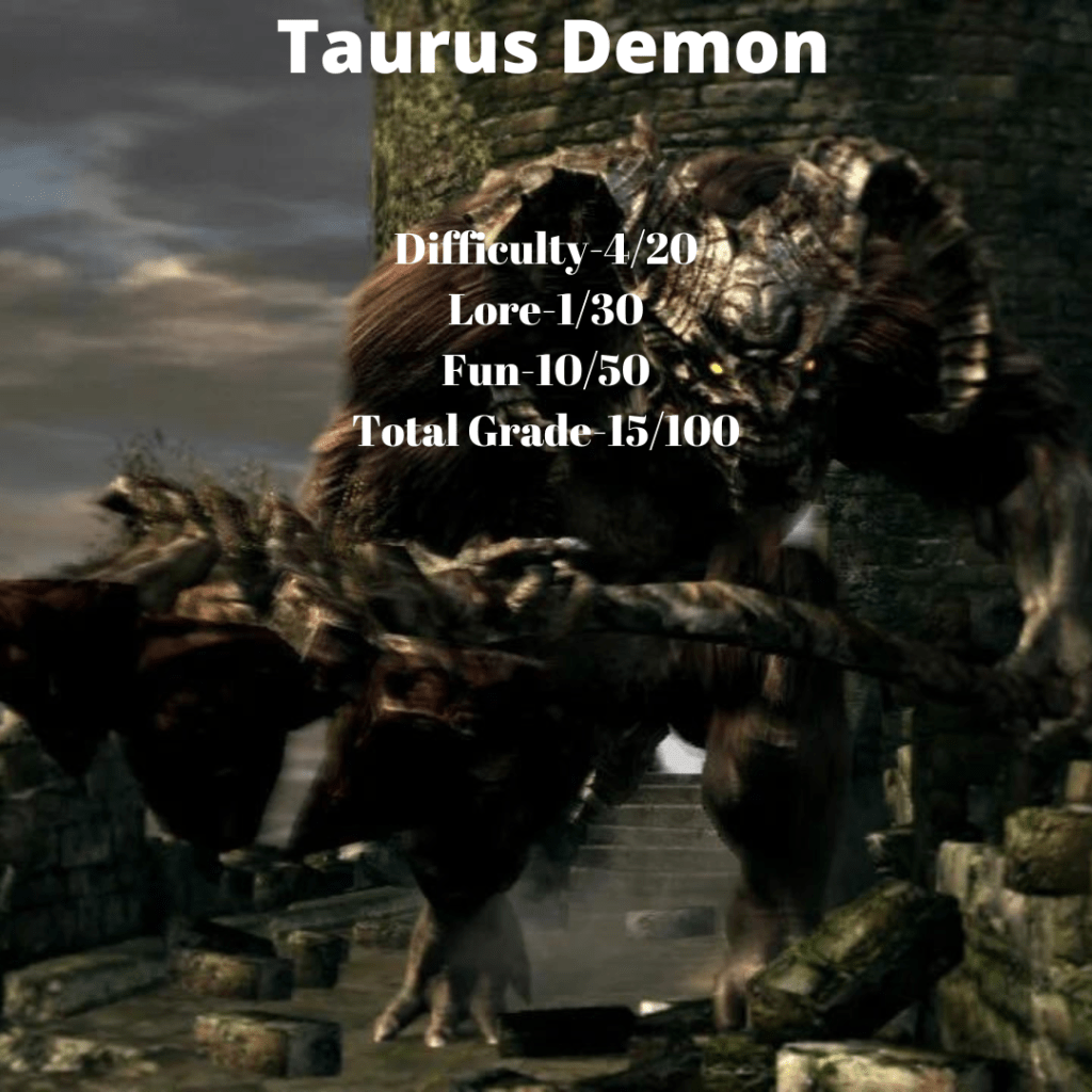 Andrew: …and speaking of ‘walking up to this guy and spamming attacks until he dies’, enter the Taurus Demon! Admittedly, there isn’t too much to actually say about this fight, as it’s very basic. It originated from a game made over a decade ago, so it can be forgiven in retrospect given how old it is. The Taurus Demon is the boss of the Undead Burg, the first non-tutorial boss the player is likely to face. It has drawn many comparisons to the Asylum Demon, being eerily similar to being a fourth version of the game’s tutorial boss. It does have enough to distinguish it, however, so it isn’t an offensively bad mess like the Demon Firesage.