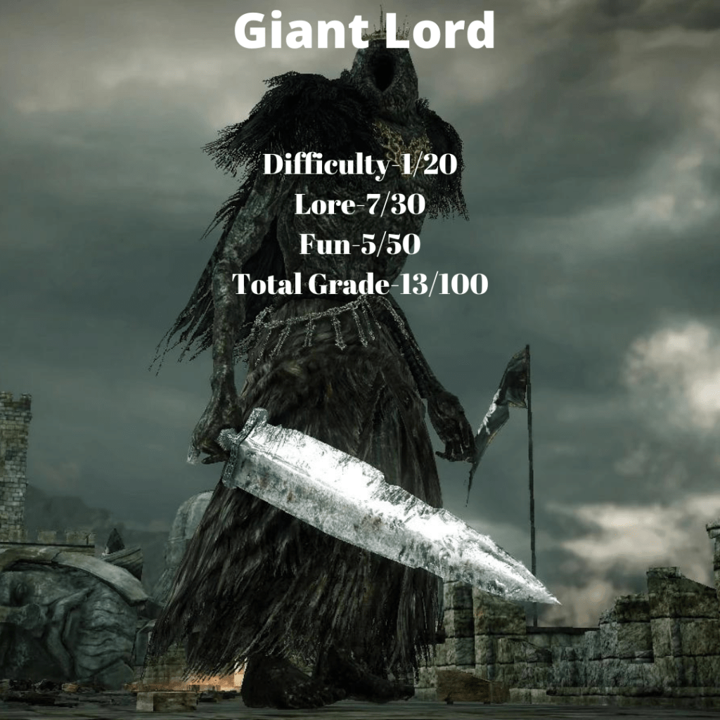 As far as difficulty goes, this boss is indeed scaled for the end game and will hit quite hard. However, he is mechanically very simple. If the player simply stays at one of his heels and lays into him, the fight will be over in about a minute. As it happens, the player will need to defeat two mini boss Giants on the way to their lord and, due to them having complex movesets and lacking simple counterplay, they actually end up posing much more of a threat than their own lord.