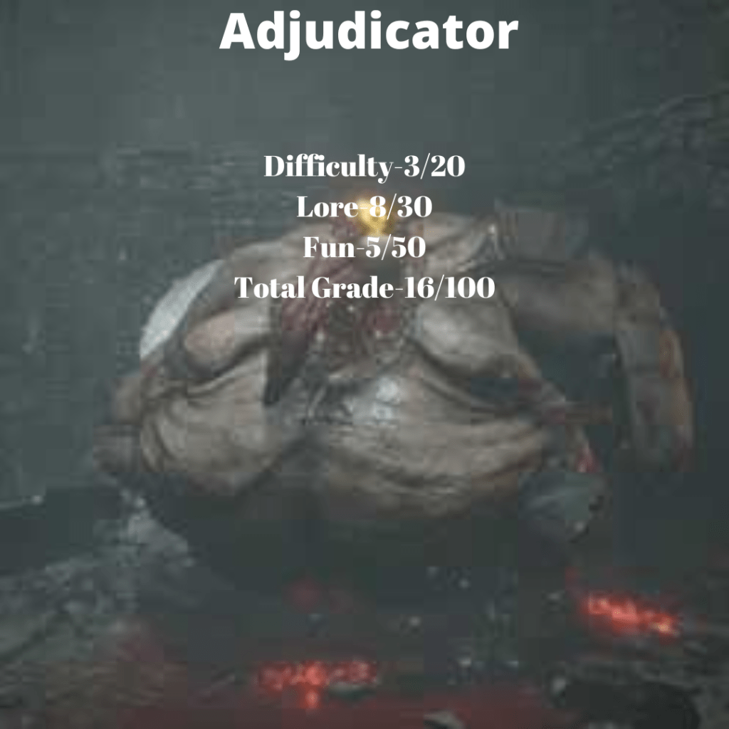 Mango: A player new to From Software games might not understand how to properly exploit Adjudicator’s weak point, so I gave it a 10 for difficulty. Since the player’s goal is to kill demons, Adjudicator being a big demon means he is important enough to the game’s story to get a 5 for lore. For fun, I gave the fight a 12. It is fun to shoot his head from afar, but it could be impossible for a melee character to fight it if they don’t know how to hit it properly.