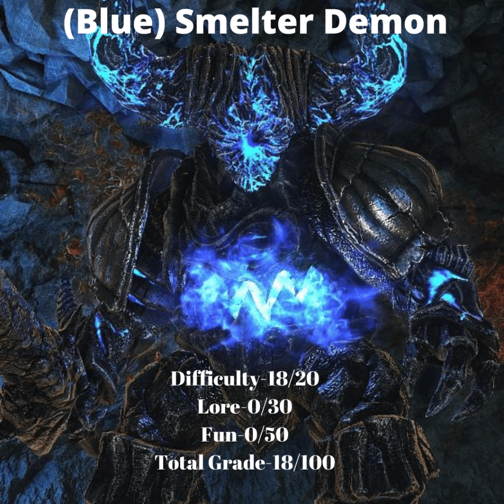 Mango: Blue Smelter Demon is definitely more challenging than its orange counterpart, with different timings on its attacks and hitting a lot harder. However, because this is mostly just a reskin, I gave it a 16 for difficulty. Lore gets just a 4 because this boss isn’t even required within the DLC, being a side boss. Finally, I didn’t appreciate this boss being a reskin- sure, it has some slight variations in attack timings, but that’s the only real difference between it and the Smelter Demon.