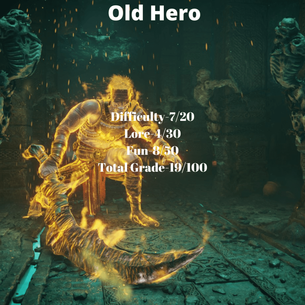 Challenge is actually not as poor as you might think. Yes, the Thief Ring makes it hard for him to hit the player. Yes, even without it, a ranged player can take him down without much issue. However, while he might not be able to track the player, the Old Hero will certainly try. He will happily swing his Large Sword of Searching errantly until it hits or he dies. He happens to hit absurdly hard, two-shotting tanky builds and destroying anything else in one swipe. This means that he can actually be quite oppressive when the player is not equipped with a Thief Ring. As such, a hit and run strategy will be needed and, even then, death due to bad luck in terms of where he chooses to swing his sword is very possible.