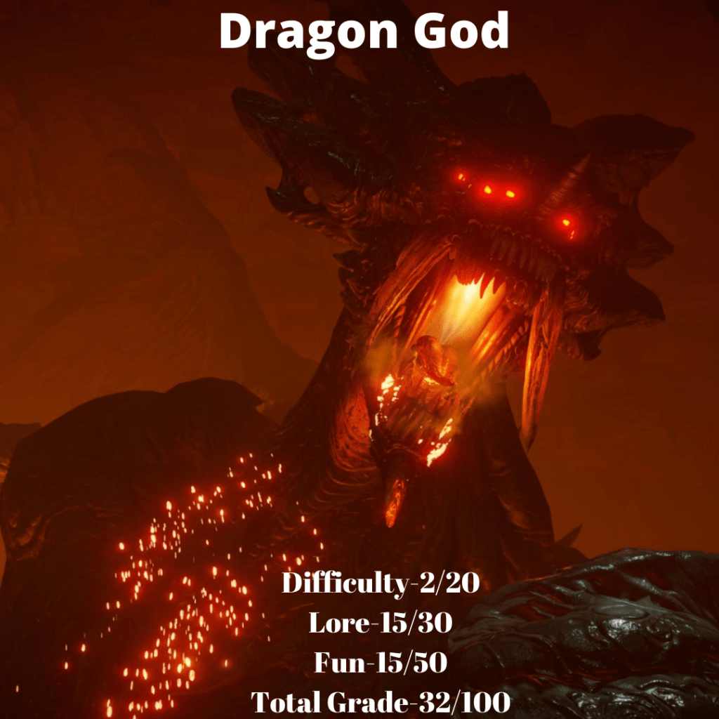 In terms of challenge, giving this fight anything higher than a 0 is being generous. Still, a player who doesn’t fully understand its mechanics can easily die, and fast, to this boss, so a few points had to be given at the very least. Depending on your build, smashing the boulders impeding the player without attracting the lethal attention of Dragon God could potentially be tricky as well.