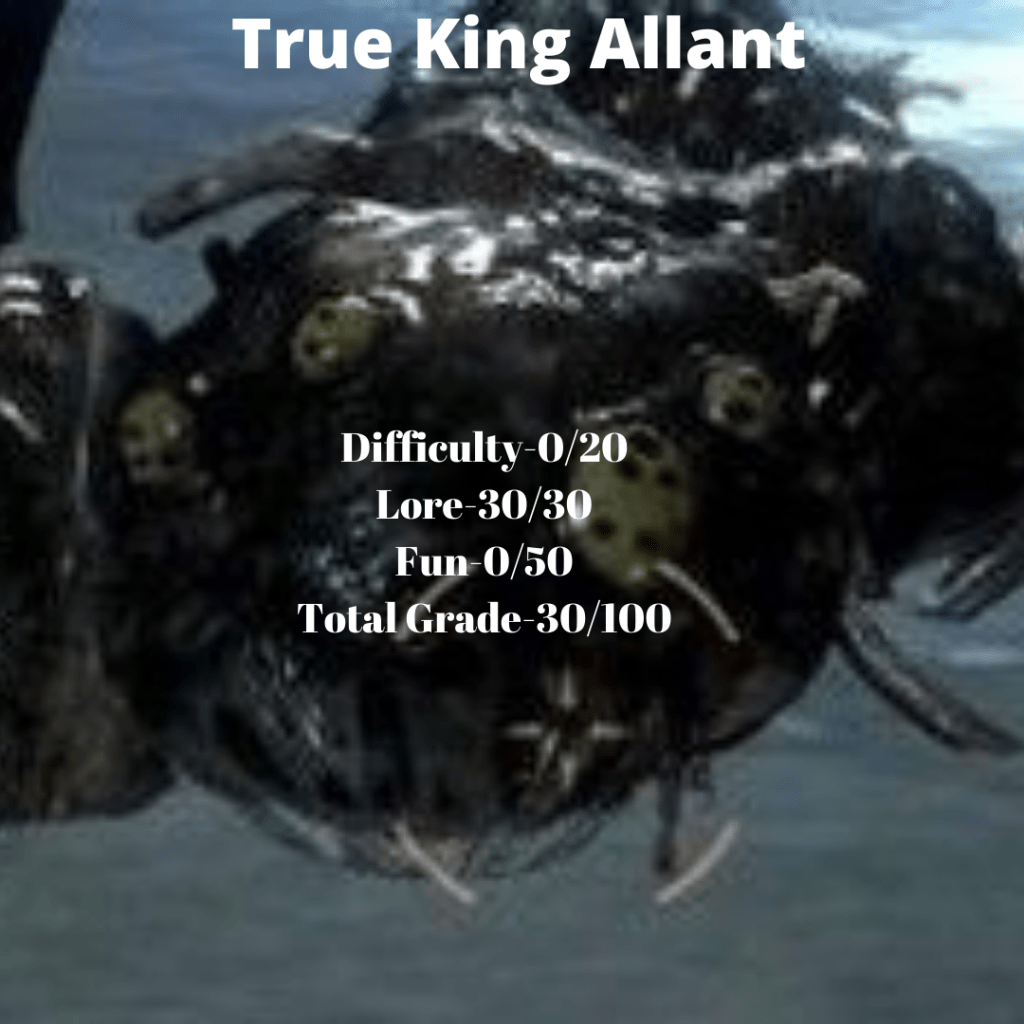True King Allant showed up on InReview’s ten easiest bosses list and it will hardly take but a moment in this fight to realize why. He is, again, just a big lump of sludge at this point. He is incapable of moving much at all, attacks very slowly and, as such, no effort at all is required to beat him. This is obviously a fight From Software never intended for the player to lose.