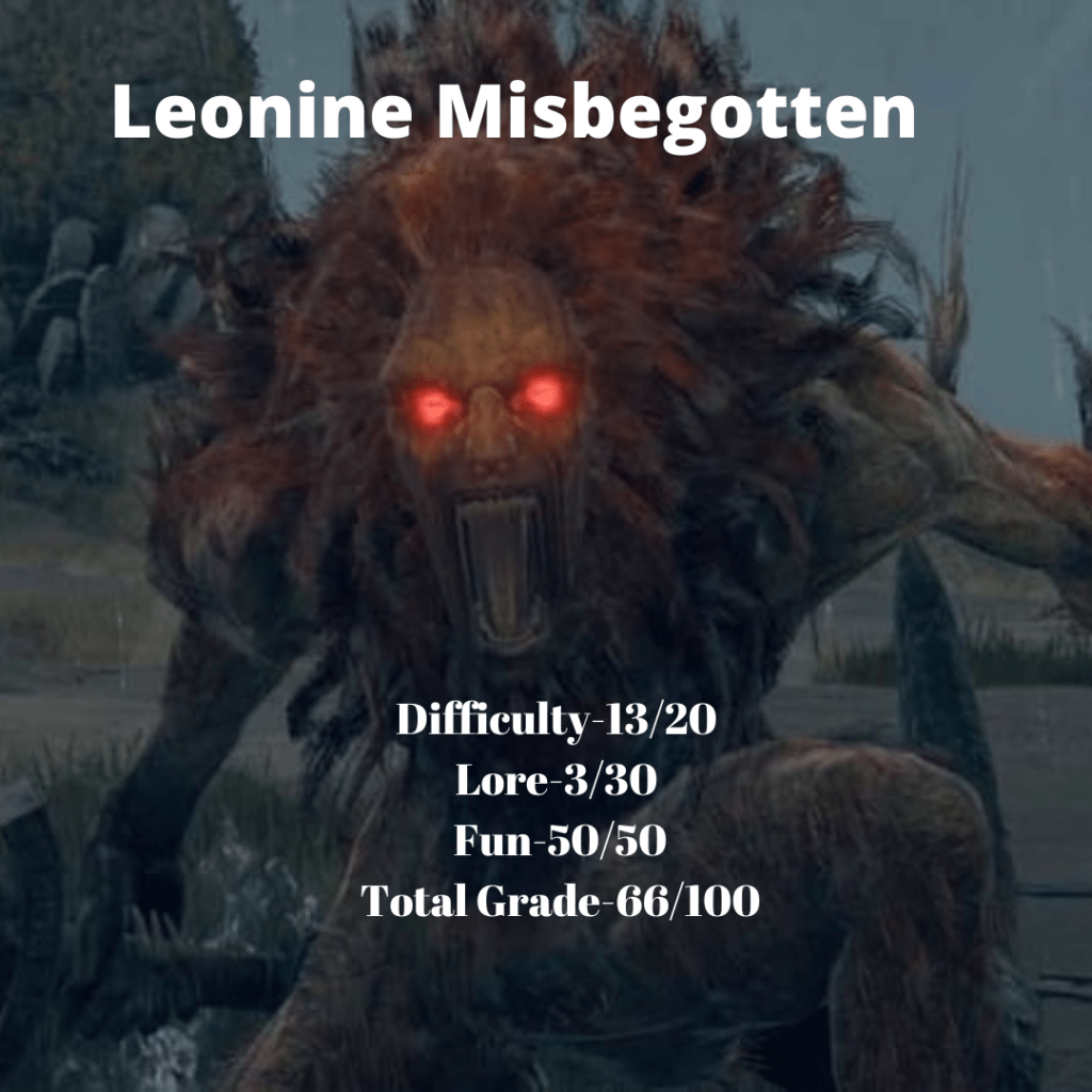 Difficulty is quite high, as Leonine Misbegotten is very aggressive and, as previously mentioned, reacting to its telegraphs is incredibly hard. It has a total of nineteen different attacks it can use, all of which either come out very fast or bear similar telegraphs to the player while being distinctly different. Reacting to it is thereby challenging and, at a low level, the player will take a lot of damage if they guess wrong. That said, Leonine Misbegotten has a pitifully small health pool and will end up dead in about ten swift hits off a regular broadsword. As a result, while guessing wrong punishes the player a lot, guessing correctly once or twice can straight up end the battle.
