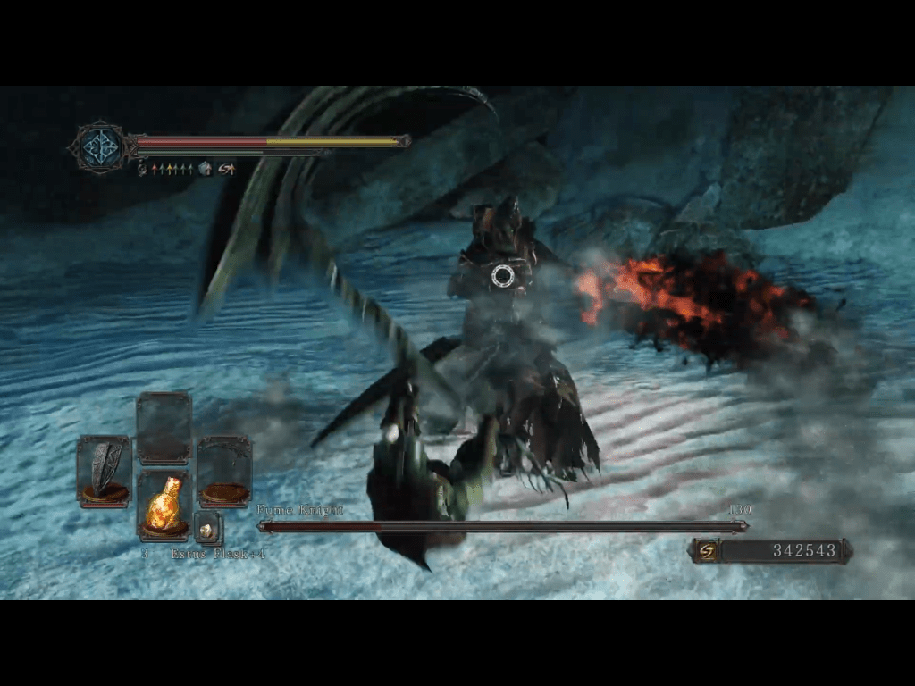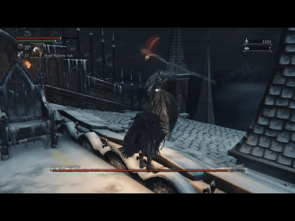 In the above picture, Martyr Logarius has quickly wound up his scythe wielding arm. He has a few different attacks that begin with this telegraph, but since we know all of his first phase attacks are projectiles, we can confidently prepare to dodge towards them and get closer to him. Using the telegraph of his weapon arm moving gives us that information ahead of time, as opposed to reacting on the fly and being vulnerable to making a mistake.