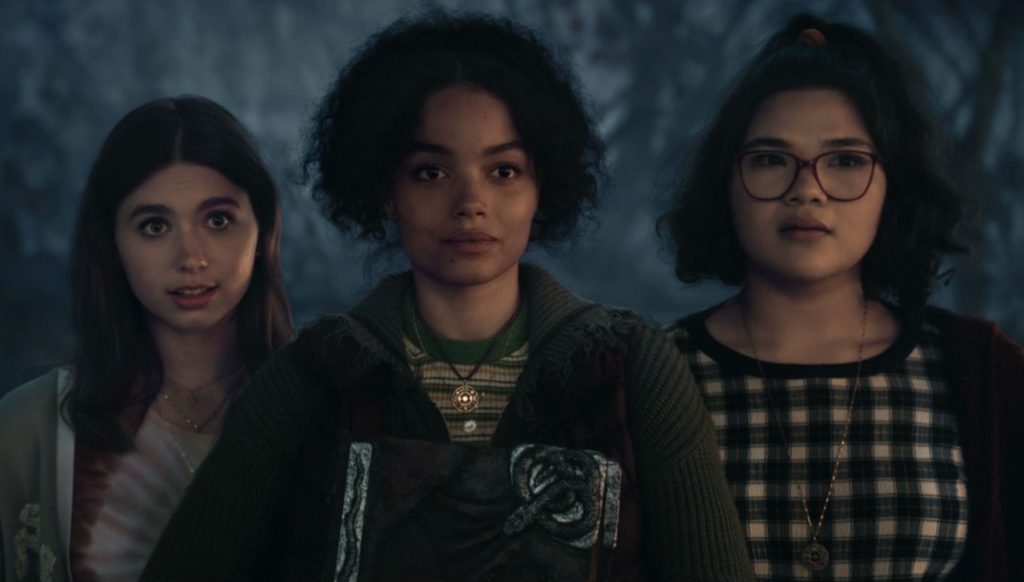 We’re introduced to younger versions of the witches in the 1600s (Taylor Paige Henderson as young Winifred Sanderson, Juju Brener as young Sarah Sanderson and Nina Kitchen as young Mary Sanderson), where they discover a spell that could make them all-powerful, which they seek out in 2022 to up the stakes. But along the way, Becca and Izzy discover they have powers, complicating the sisters’ plans to acquire plot armor.