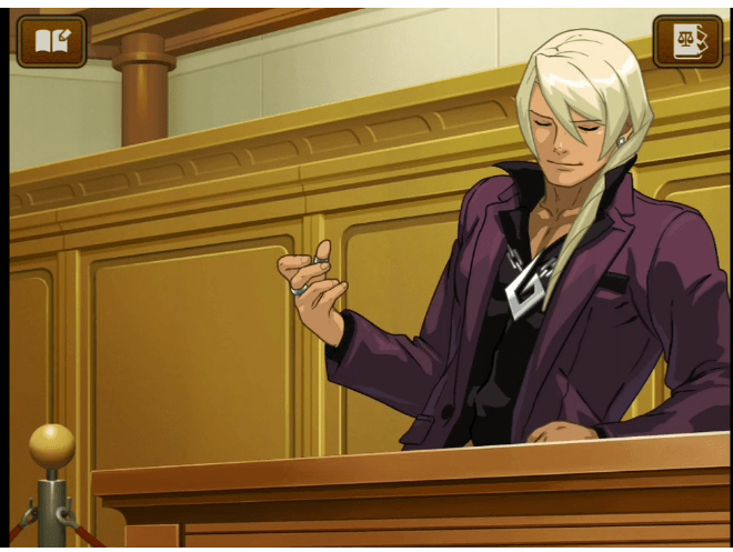 As for Gavin himself, he is arguably the coolest, most well made prosecutor the series has seen. Considering we got Miles Edgeworth and Godot in the Phoenix Wright trilogy, that is a pretty massive claim to make. Gavin is well-versed with the law and is very intelligent, letting him pose competent opposition to the player as you’d expect. However, his background in rock makes him a lot more interesting than the sum of his initial parts. Occasionally, he will play the air guitar loudly and elaborately before he refutes a point the player made. His general demeanor is very stern and serious, while also being playful and casual at the same time.