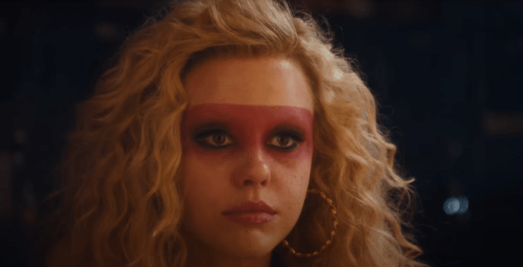 Indeed, “Pearl” greatly enhances this film, particularly by highlighting just how precarious the ledge Maxine is on truly is. Maxine is a porn actress who is trying to break into mainstream films, which her agent, Teddy Knight (Giancarlo Esposito), is hellbent on her achieving. In fact, she seems to have an innate ability to draw people to her side, with the director (Elizabeth Debicki) of the fictional horror film “Puritan II” ready to risk her career in order to give Maxine her big break via it.